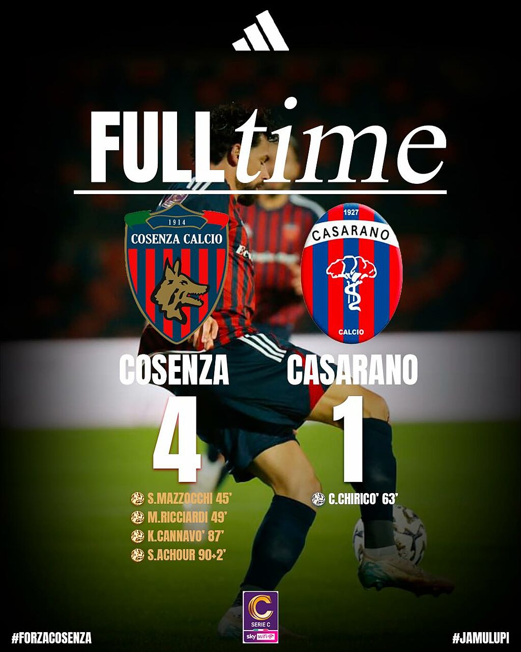 COSENZA (4-3-3): Vettorel; Cimino (45’ st D’Orazio), Dametto, Caporale, Ferrara; Kouan, Langella, Garritano (21’ st Contiliano); Ricciardi (21’ st Achour), Mazzocchi (22’ st Dalle Mura), Florenzi (30’ st Cannavò). In panchina: Pompei, Barone, Begheldo, Contiero, D’Orazio, Rocco, Mazzulla. All. : Buscè