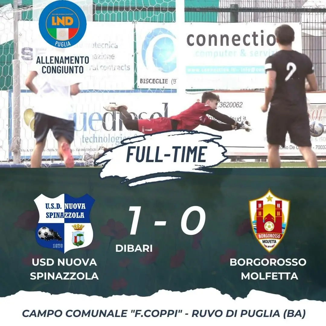 In quel di Ruvo finisce 1-0 per i nostri ragazzi contro il Borgorosso Molfetta. Gara amichevole disputata ieri pomeriggio, il giorno dopo l'allenamento congiunto con il Don Uva. Gol vittoria di Di Bari.