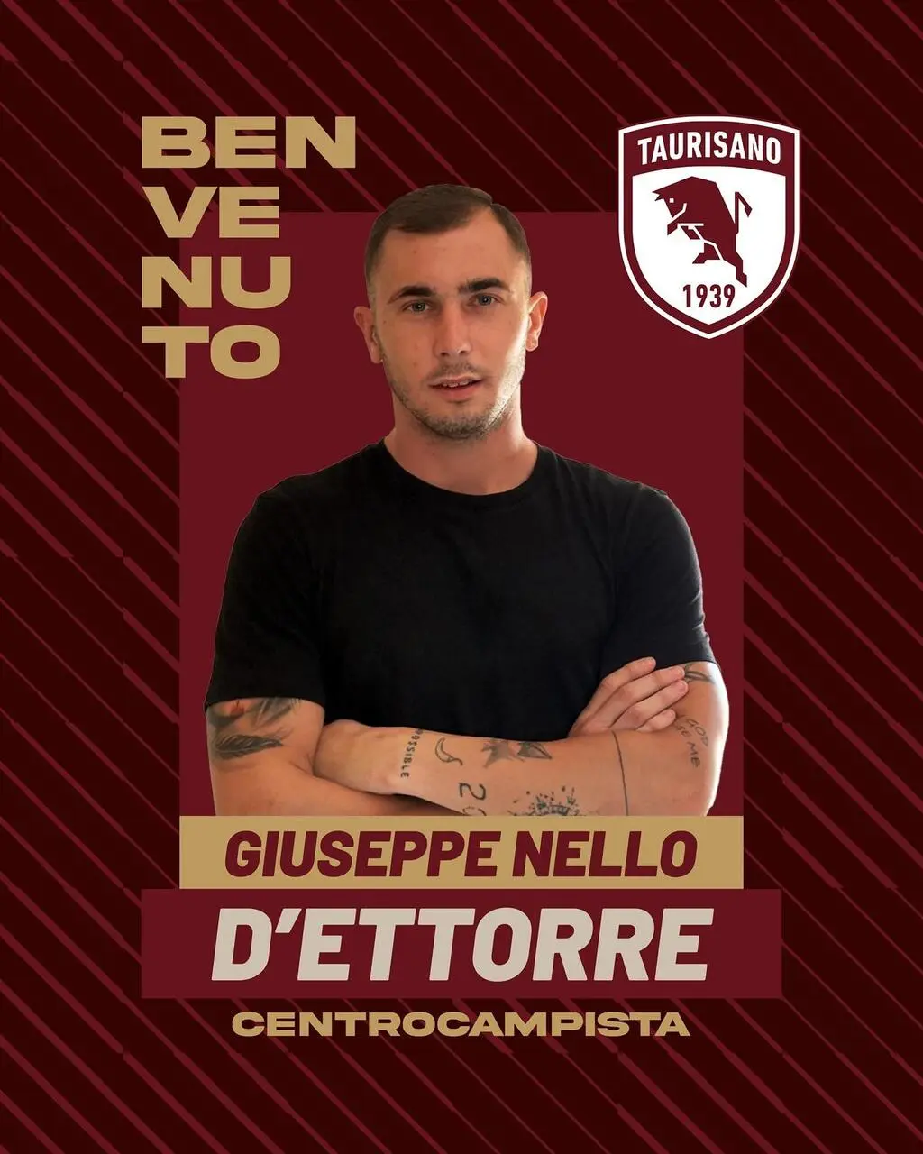 La società ASD Taurisano 1939 comunica di aver acquisito le prestazioni sportive del calciatore 𝗚𝗶𝘂𝘀𝗲𝗽𝗽𝗲 𝗡𝗲𝗹𝗹𝗼 𝗗’𝗘𝗧𝗧𝗢𝗥𝗥𝗘, centrocampista classe 2000.
