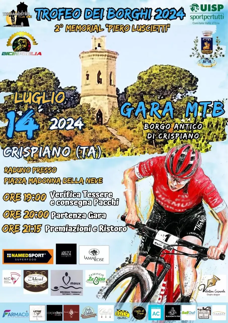 Si parte con la seconda edizione del Trofeo Piero Luscietti, organizzato dall'Asd Terranostra Teambike: il percorso è stato tracciato in modo da coinvolgere il Centro Storico di Crispiano, comprensivo di una zona pavimentata molto caratteristica.