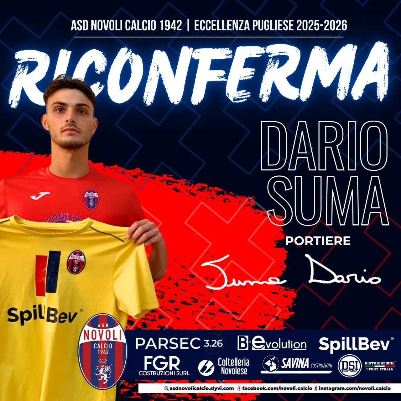 Un'altra riconferma dal peso specifico particolare, un'altra pedina che ha saputo conquistare i tifosi #rossoblù in pochi mesi per professionalità e bravura, un altro sforzo della società novolese, in tutte le sue componenti, nel voler affidare la porta del Novoli Calcio a 𝑫𝒂𝒓𝒊𝒐 𝑺𝒖𝒎𝒂. Classe 2001 con tanta esperienza in diversi club importanti di Serie D ed #EccellenzaPugliese, l'estremo difensore difenderà i pali anche nella stagione 2025/2026 del "Girone Unico", mettendo a disposizione di mister Luperto e del gruppo quei valori che abbiamo saputo conoscere e apprezzare la scorsa stagione. La sessione estiva di #calciomercato non si fermerà qui, considerato che lo staff dirigenziale e tecnico lavorano fianco a fianco per migliorare e allargare la rosa, già impegnata da lunedì nel lavoro di preparazione fisica e atletica.