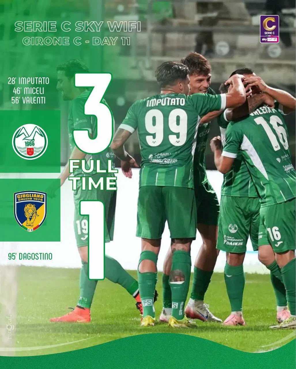 Giugliano (3-5-2): Russo; Laezza, Del Fabro, Caldore; D’Avino (1’ st Njambe), Peluso (1’ st D’Agostino), De Rosa, Zammarini, Vaglica (1’ st La Vardera); Nepi (19’ st Prado), Balde (34’st Milan). All.: Capuano