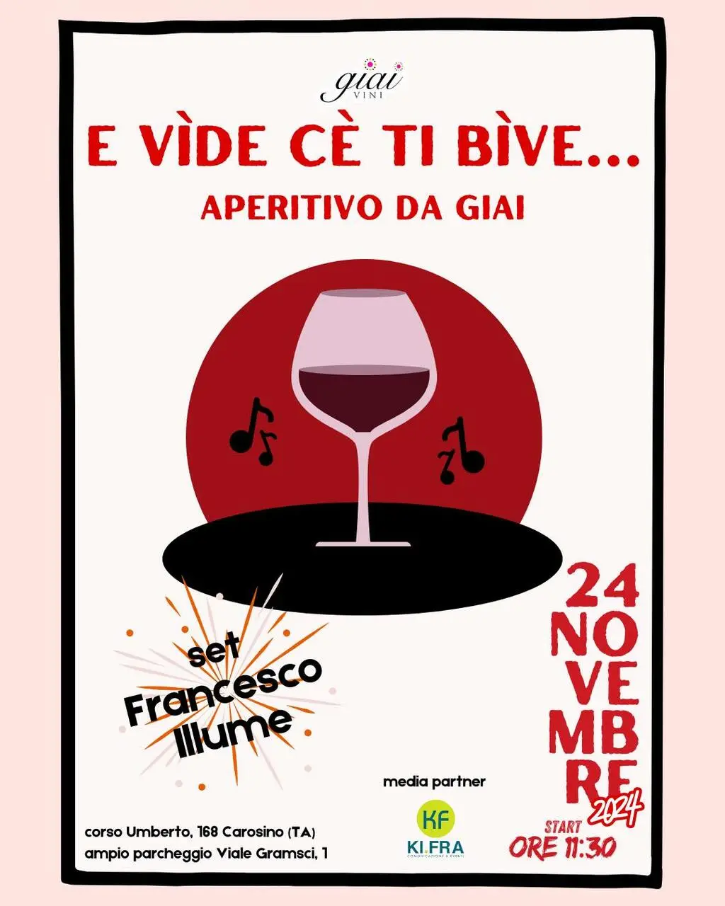 Domenica 24 novembre, a partire dalle ore 11:30, aperitivo da Giai Vini, tra le cantine più apprezzate della provincia di Taranto e non solo. Ottimo vino e l'imperdibile set di Francesco Illume