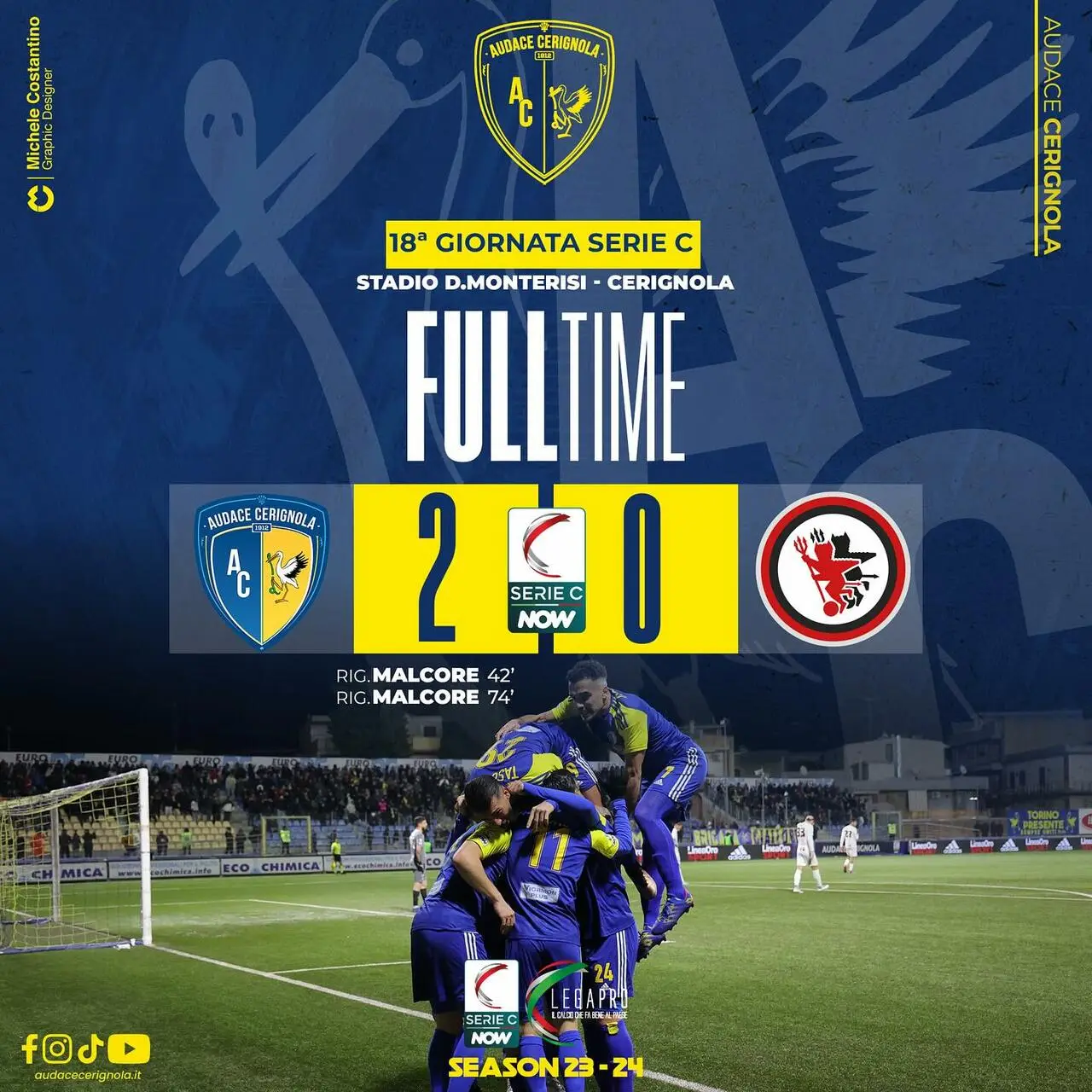 Cerignola (4-3-2-1): Krapikas; Coccia, Allegrini (31′ Capomaggio), Gonnelli, Russo; Tascone, Ruggiero (88′ Bezzon), Bianco; D’Andrea (70′ Leonetti), D’Ausilio (70′ Sosa); Malcore (89′ Neglia)