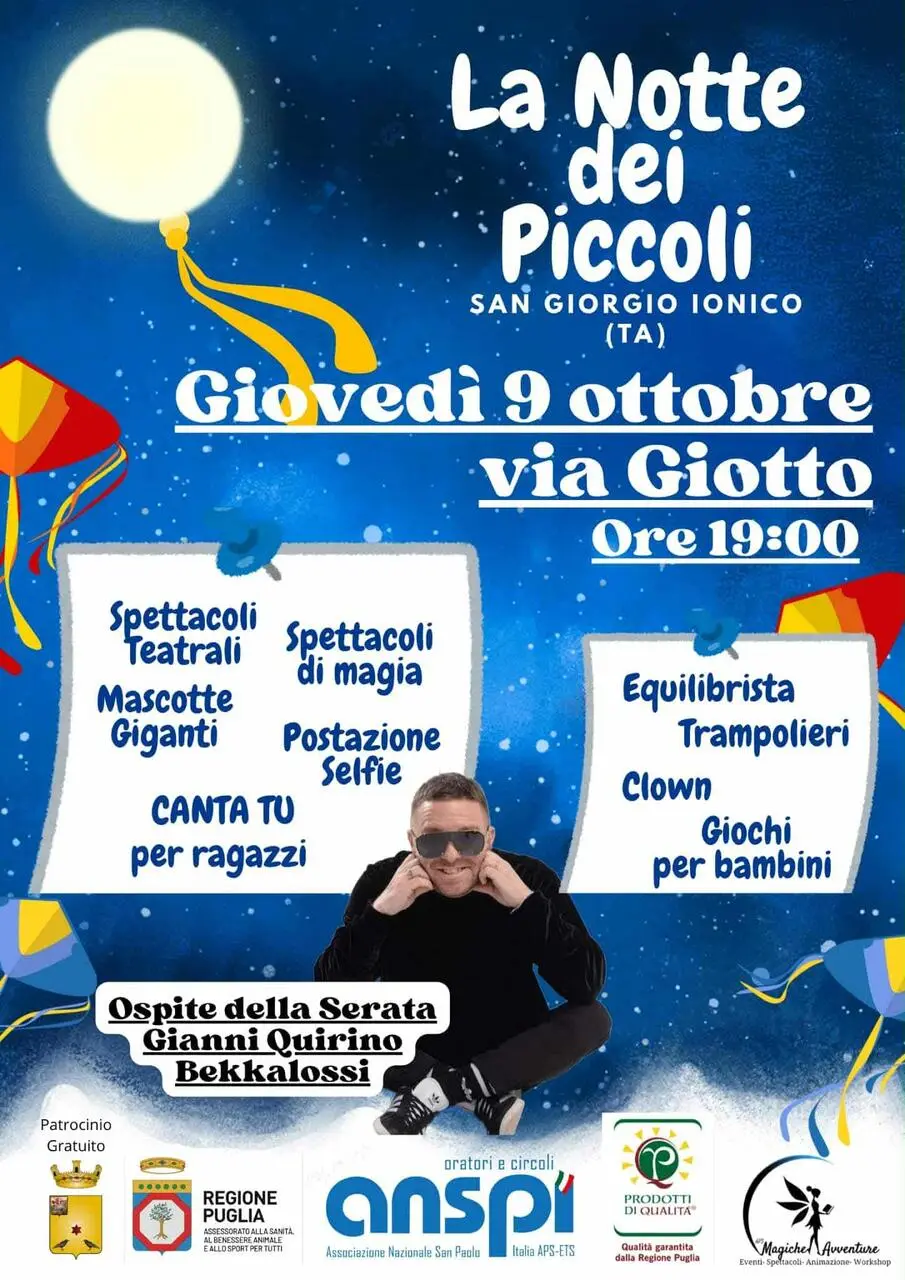 E’ tutto pronto per la “Notte dei Piccoli” grande evento che si terrà giovedì 9 ottobre dalle ore 19:00 in Via Giotto a San Giorgio Ionico. Per l’occasione ad animare l’evento ci saranno Hulk e Iron Man dell’Associazione Giò Giò e i Supereroi che animeranno la splendida serata sangiorgese. Non mancate, vi aspettiamo!
