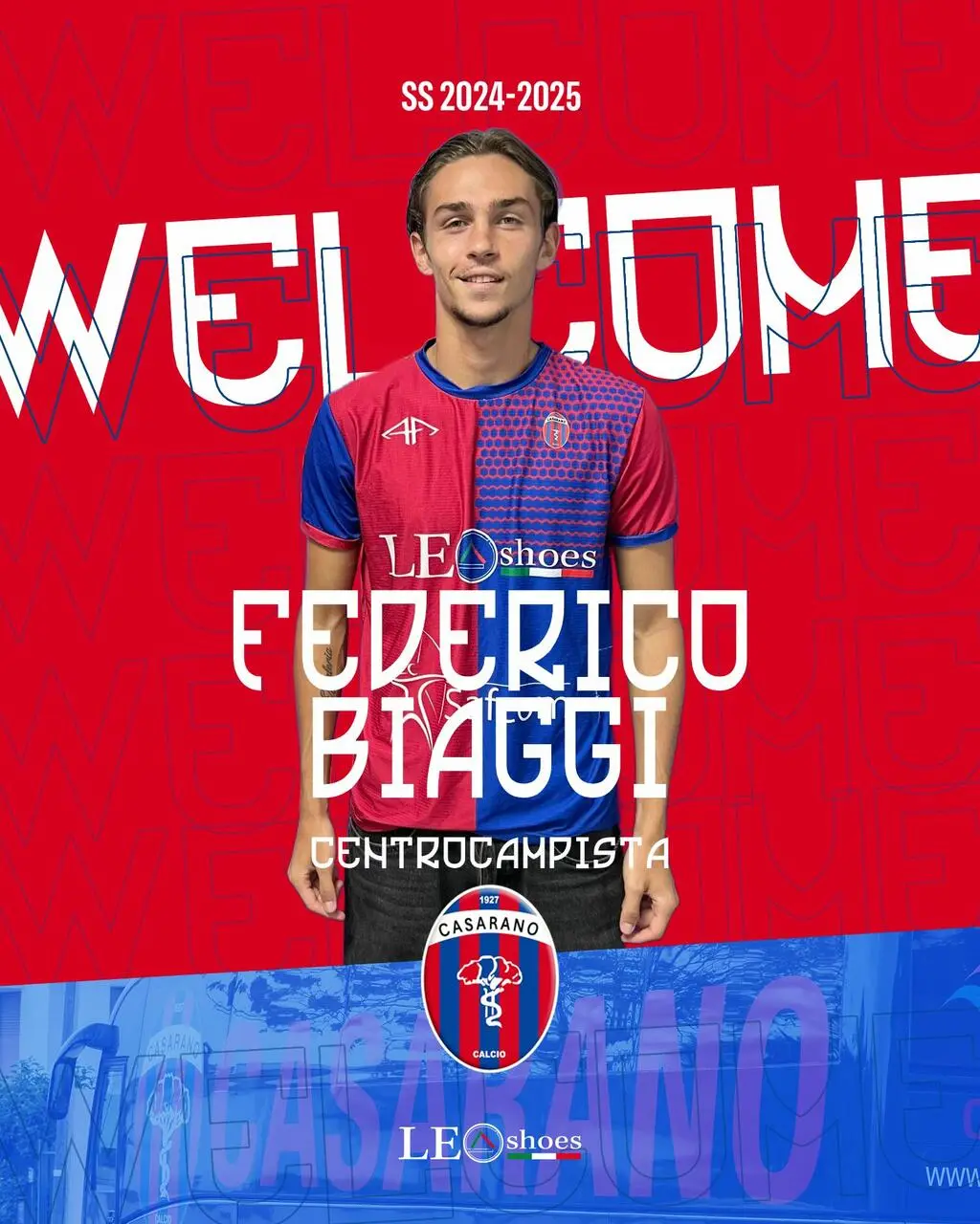 La società Casarano calcio comunica di aver acquisito il diritto alle prestazioni sportive del calciatore Federico Biaggi, centrocampista, classe 2003. Cresciuto calcisticamente nel Genoa dove ha fatto tutta la trafila delle giovanili, nel 2022 ha giocato in serie D – girone B- nel Varesina (16 presenze) e poi nel Seravezza Pozzi e, sempre nella passata stagione, da gennaio, nella Pistoiese.