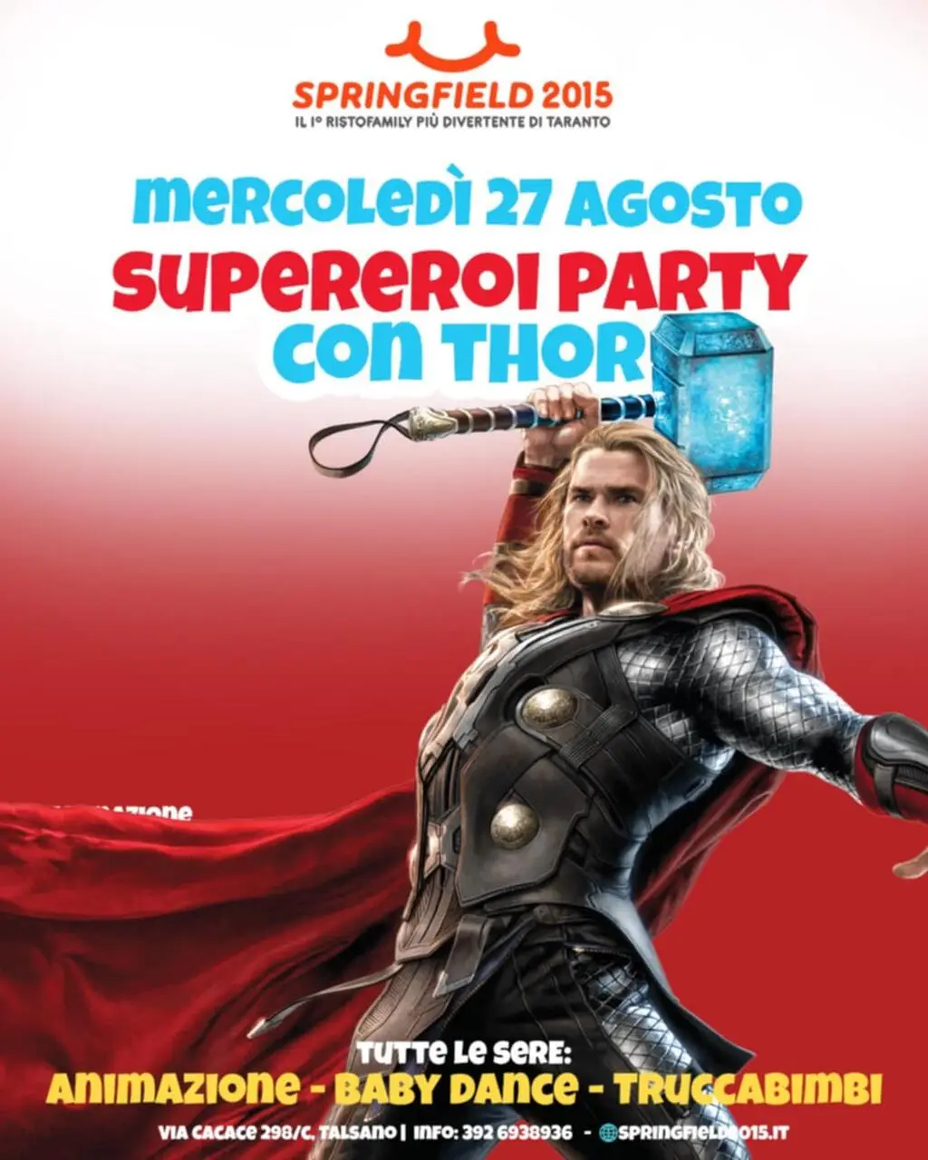 Ultimo grandissimo appuntamento a Talsano, presso il locale Springfield 2015, con i personaggi dell'Associazione Giò Giò e i Supereroi. Dopo tre entusiasmanti appuntamenti mercoledì 27 agosto toccherà a Thor animare la serata facendo, come sempre, divertire i presenti e scattare foto. Non potete mancare…