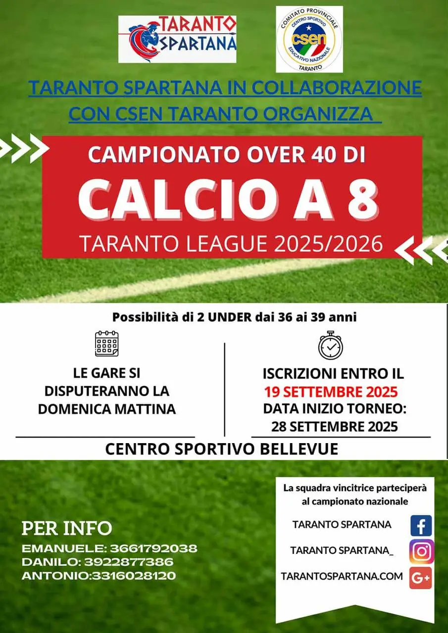 In casa ASD Taranto Spartana si lavora come sempre in modo certosino in vista dell’inizio delle varie competizioni. Tra queste c’è il campionato Over 40 di calcio a 8 – Taranto League 2025/26 (possibilità di due under dai 36 ai 39 anni) che si giocherà tutte le domeniche mattina presso il Centro Sportivo Belle Vue. Le iscrizioni saranno aperte fino al 19 settembre con l’avvio della manifestazione fissato per il 28 settembre. Per maggiori informazioni chiamare Emanuele al 3661792038, Danilo 3922877386 o Antonio al 3316028120.