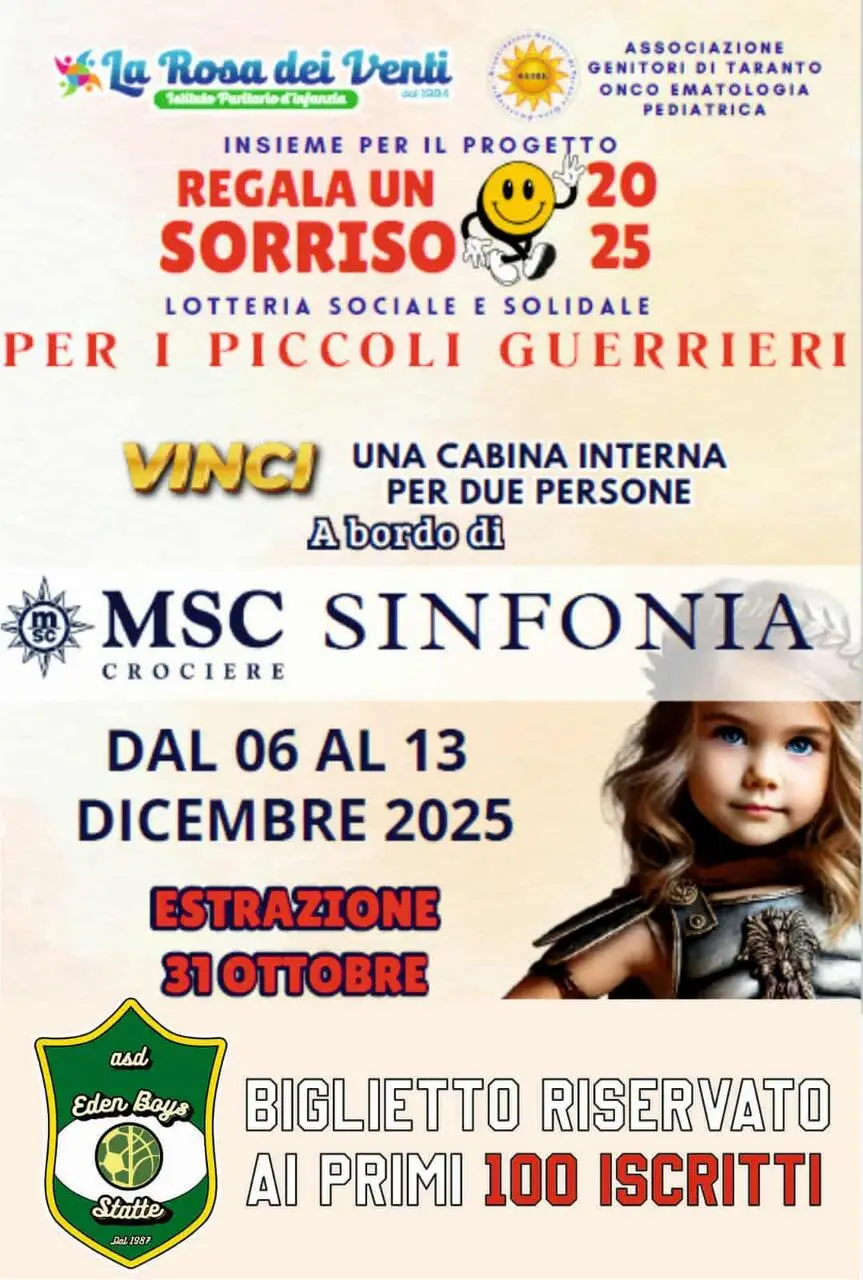 In casa Eden Boys Statte sta per iniziare un’altra settimana di duro e intenso lavoro con tutte le categorie (sia del settore calcio che di quello basket) che continueranno a sudare sotto gli occhi vigili dell’assortito e preparato staff tecnico. Inoltre la storica società stattese (oltre agli orari) ci tiene a ricordare che ogni iscritto, in occasione della stagione 2025-26, avrà diritto ad un kit gratuito e che i primi cento iscritti avranno diritto ad un biglietto che tramite un’estrazione solidale (progetto Regala un Sorriso 2025) che si terrà il 31 ottobre darà la possibilità di vincere una crociera che si terrà dal 6 al 13 dicembre 2025