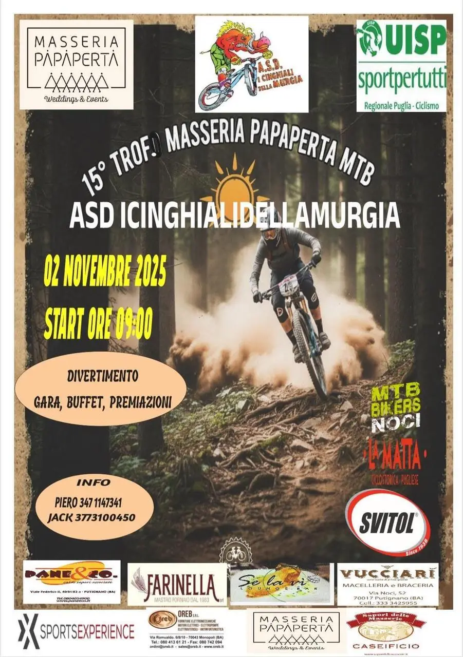 La grande mountain bike torna protagonista tra i boschi della Murgia con la 15ª edizione del Trofeo Masseria Papaperta, in programma domenica 2 novembre 2025 a Putignano, presso la suggestiva Masseria Papaperta (SS 172 km 27,900).