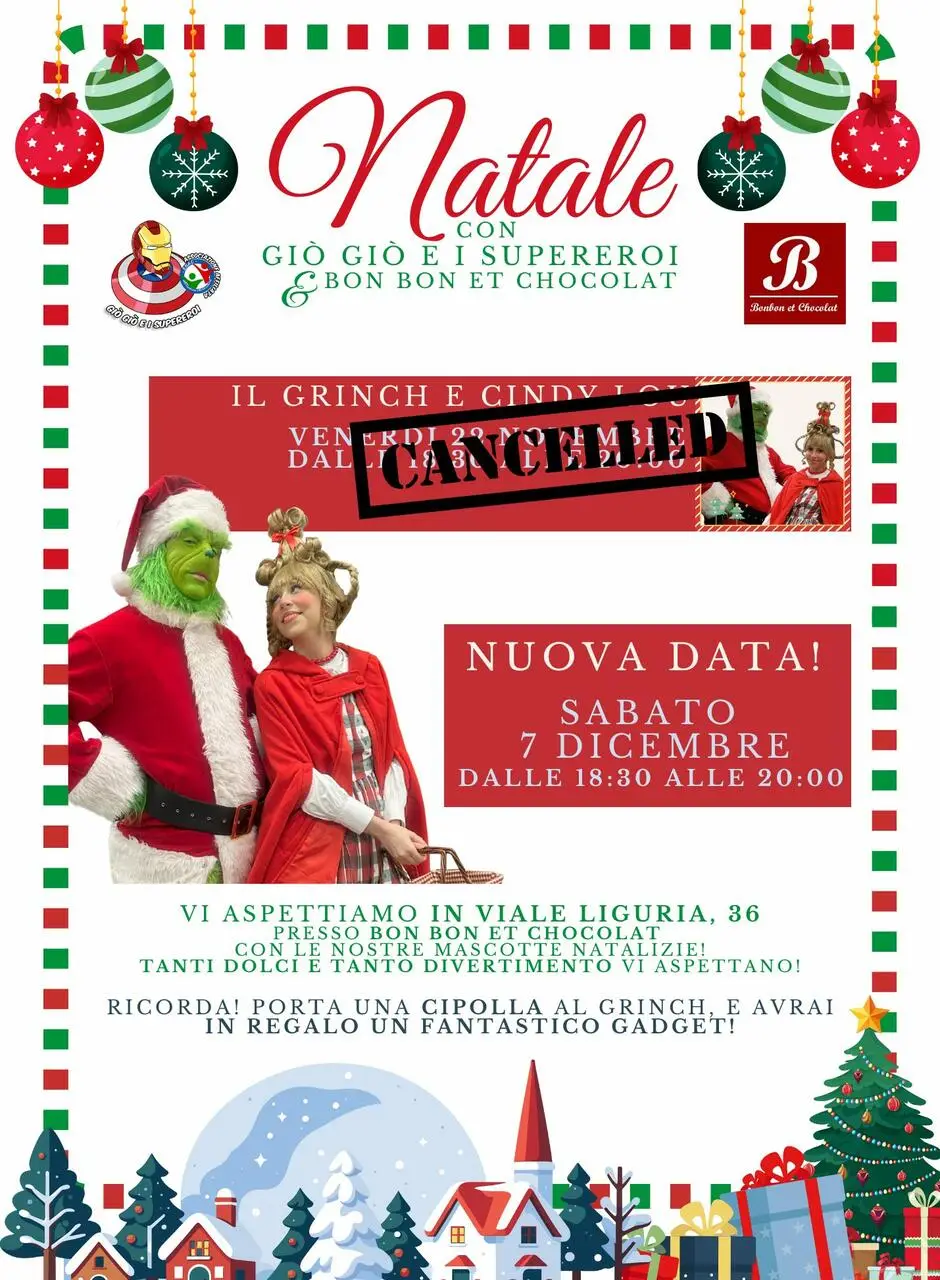 Continua il magico Natale con i personaggi dell’Associazione Giò Giò e i Supereroi: il 7 e il 14 dicembre presso “Bon Bon Et Chocolat (Via Liguria 26) ci sarà da divertirsi con il Grinch e Cindy Lou nel primo dei due appuntamenti (dalle 18:30 alle 20) e con Babbo Natale e l’Elfetta nel secondo (dalle (dalle 18 alle 20). Non mancate e venite tutti a scattarvi una bella foto con i vostri “beniamini” del Natale.