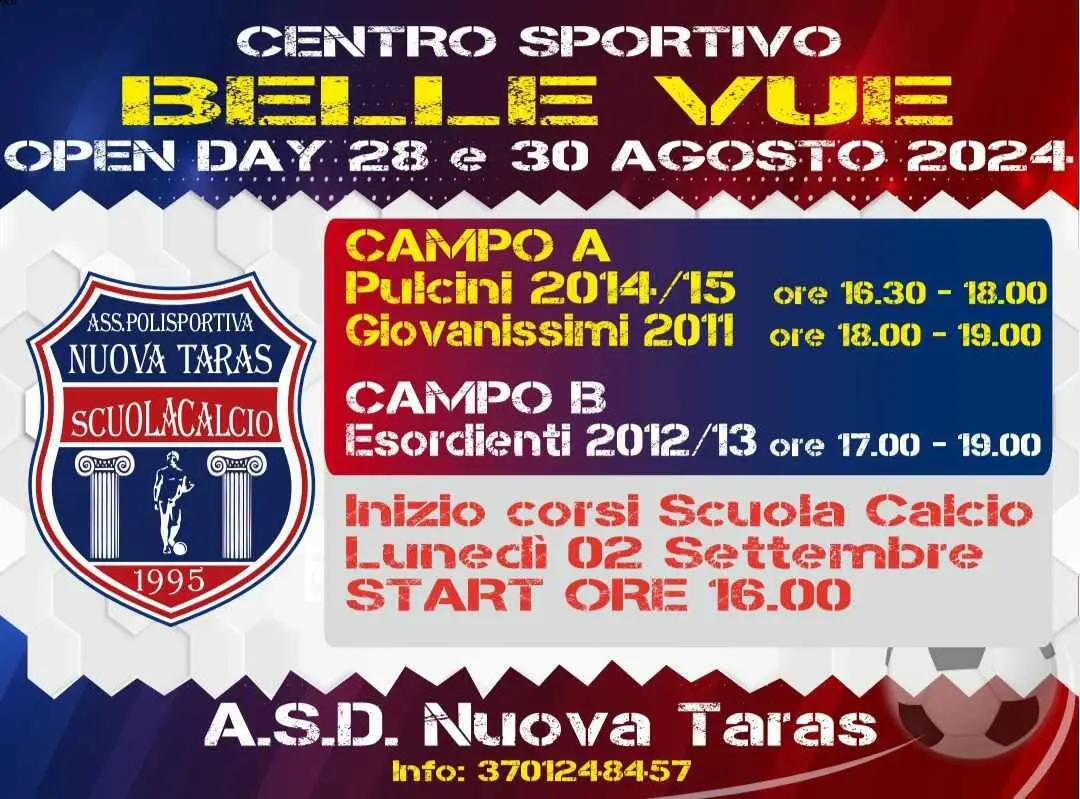 In vista della ripresa dei corsi che si terrà il 2 settembre dalle ore 16 in casa Nuova Taras nei giorni 28 e 30 agosto si terranno altri due Open Day presso il Centro Sportivo Belle Vue. Questi saranno organizzati per le categorie Pulcini 2014/15 dalle ore 16:30 alle ore 18:00 e per Giovanissimi 2011 dalle ore 18:00 alle ore 19:00 (sul campo A) e per Esordienti 2012/13 dalle 17:00 alle 18:00 (sul campo B). Per maggiori info chiamare il 3701248457.