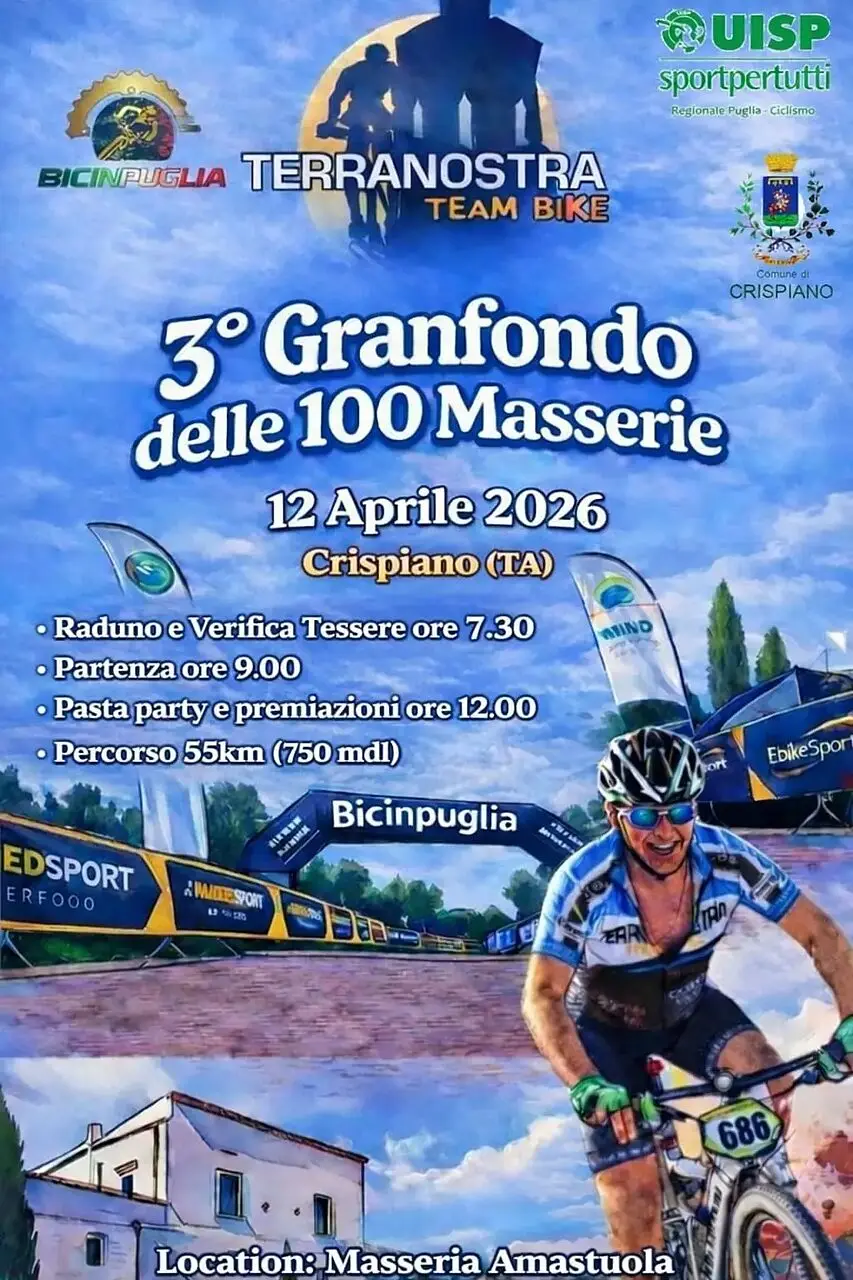 Sarà la suggestiva cornice di Crispiano, con partenza e arrivo presso la Masseria Amastuola, ad ospitare uno degli appuntamenti più attesi del circuito Bicinpuglia: la Granfondo delle 100 Masserie, in programma il 12 aprile 2026 .