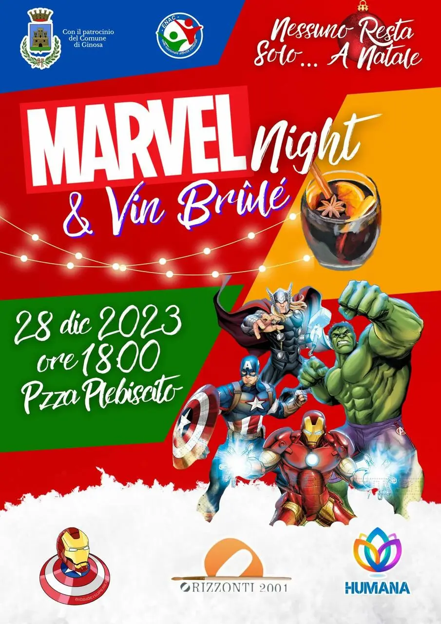 Tutto pronto per un’altra fantastica serata in compagnia degli eroi della Giò Giò e i Supereroi che, in occasione dell'evento "Marvel Night & Vin Brulè", giovedì 28 dicembre torneranno a Ginosa per far divertire grandi e piccini e scattare foto. Appuntamento, davvero, imperdibile visto che, dalle ore 19:30 in Piazza Plebiscito, tutti i presenti potranno divertirsi con Iron Man, Capitan America e Spider Man. Per l’occasione si ringrazia “Orizzonte 2001”.