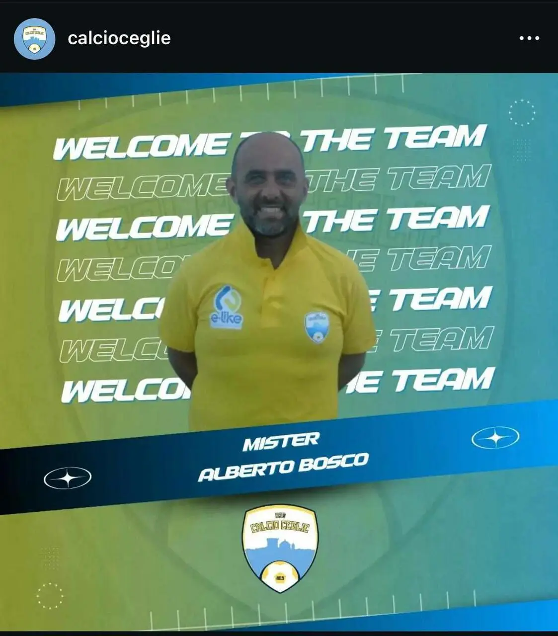 La società calcio Ceglie e ‘ lieta di comunicare di aver affidato la guida tecnica della prima squadra che in questa stagione 2024/2025 disputerà il campionato di prima categoria ad Alberto Bosco . Il mister vanta un curriculum di tutto rispetto . Ripercorriamo insieme la sua esperienza: Comincia ad allenare all’età di 26 anni per un breve periodo con la polisportiva castello , successivamente siede sulla panchina della Virtus Taranto dove vince 3 campionati di fila , portando la stessa dalla terza alla prima categoria . Continua la sua carriera guidando il Grottaglie , ancora Virtus Taranto , la Puglia sport Bari , massafra nel campionato di eccellenza , il Grottaglie con cui disputa prima la juniores nazionale vincendo i playoff e poi la prima squadra in serie D nella stagione sportiva 2013-2014