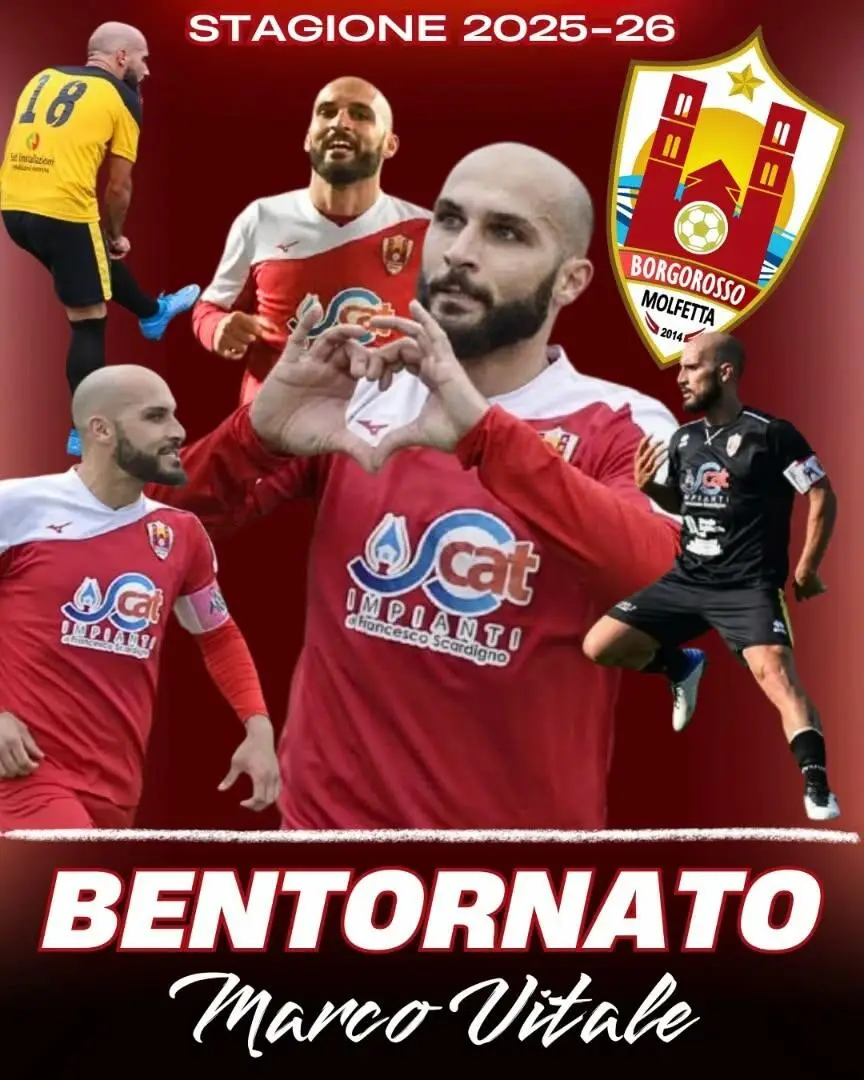 Il Borgorosso Molfetta è orgoglioso di annunciare il ritorno in maglia biancorossa di 𝗠𝗮𝗿𝗰𝗼 𝗩𝗶𝘁𝗮𝗹𝗲, centrocampista offensivo classe 1993 e autentico punto di riferimento del calcio molfettese. Giocatore duttile, dotato di estro, visione di gioco e una tecnica sopraffina, Vitale rappresenta un innesto di assoluto prestigio per il campionato di Promozione 2025-26. Oltre alle sue qualità in campo, Marco porta con sé importanti doti umane e caratteriali che lo rendono un leader naturale all'interno dello spogliatoio.