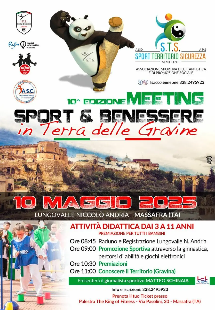 Torna anche quest’anno uno degli appuntamenti più attesi nel panorama sportivo-educativo del Sud Italia: il “Meeting Sport & Benessere in Terra delle Gravine”, giunto alla sua 10ª edizione. L’evento si svolgerà sabato 10 maggio 2025 nella suggestiva cornice del Lungovalle Niccolò Andria a Massafra, e sarà dedicato interamente ai bambini dai 3 agli 11 anni.