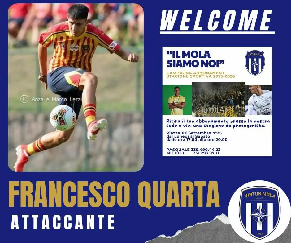 Ecco qua il rinforzo che ci voleva nel reparto offensivo. Punta centrale, classe 2001, cresciuto nelle giovanili del Lecce e con alle spalle campionati tra Serie D ed Eccellenza con squadre come Melfi, Castelnuovo, Vado, Sestri Levante, Francesco Quarta è della Virtus Mola.