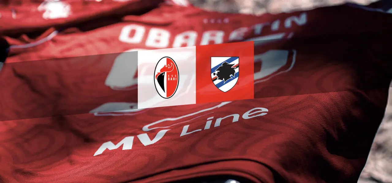 Squadre in campo al San Nicola: Bari in completo bianco con inserti rossi, Samp con maglia blucerchiata, calzoncini e calzettoni blù.
