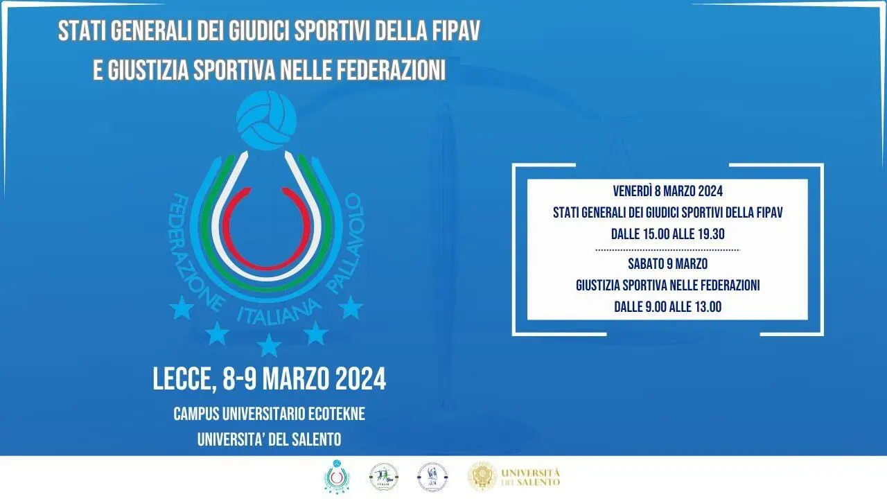 Si terrà venerdì 8 e sabato 9 marzo a Lecce, presso il Campus Universitario Ecotekne dell'Università del Salento, il primo convegno nazionale che coinvolgerà i membri della Giustizia Sportiva FIPAV. "Stati Generali dei Giudici Sportivi FIPAV, giustizia sportiva nelle Federazioni", il titolo della due giorni di incontro, sarà occasione di confronto sulle diverse tematiche che riguardano l'attività dei Giudici Sportivi in un momento di confronto anche con altre Federazioni. La giornata del sabato, infatti, coinvolgerà rappresentanti della Giustizia di altre Federazioni Sportive. L'incontro organizzato dalla Federazione Italiana Pallavolo, realizzato grazie al supporto di Università del Salento, del CR FIPAV Puglia e CT FIPAV Lecce, è rivolto a tutti i Giudici Territoriali d'Italia e agli organi della giustizia nazionale FIPAV.