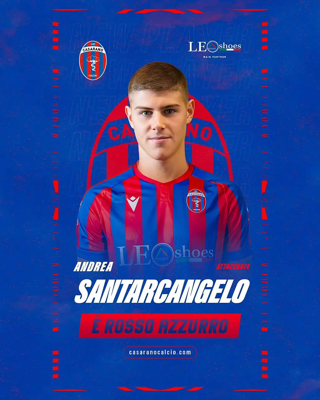 La società Casarano calcio comunica di aver acquisito le prestazioni professionali del calciatore Andrea Santarcangelo, attaccante, classe 2003, che arriva a titolo definitivo dal Picerno, dove ha disputato 15 gare, segnando 2 reti.
