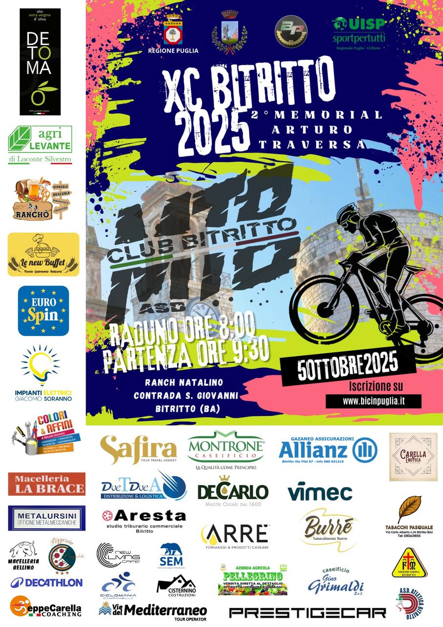 Bitritto si prepara ad accogliere l’XC Bitritto – 2° Memorial Arturo Traversa, in programma domenica 5 ottobre e valido come terzultima tappa del Gran Premio XC del circuito Bicinpuglia 2025. L’evento, organizzato dall’ASD MTB Club Bitritto in collaborazione con la UISP Puglia, si annuncia come una delle prove più attese del calendario, capace di coniugare tecnica, spettacolo e paesaggio.