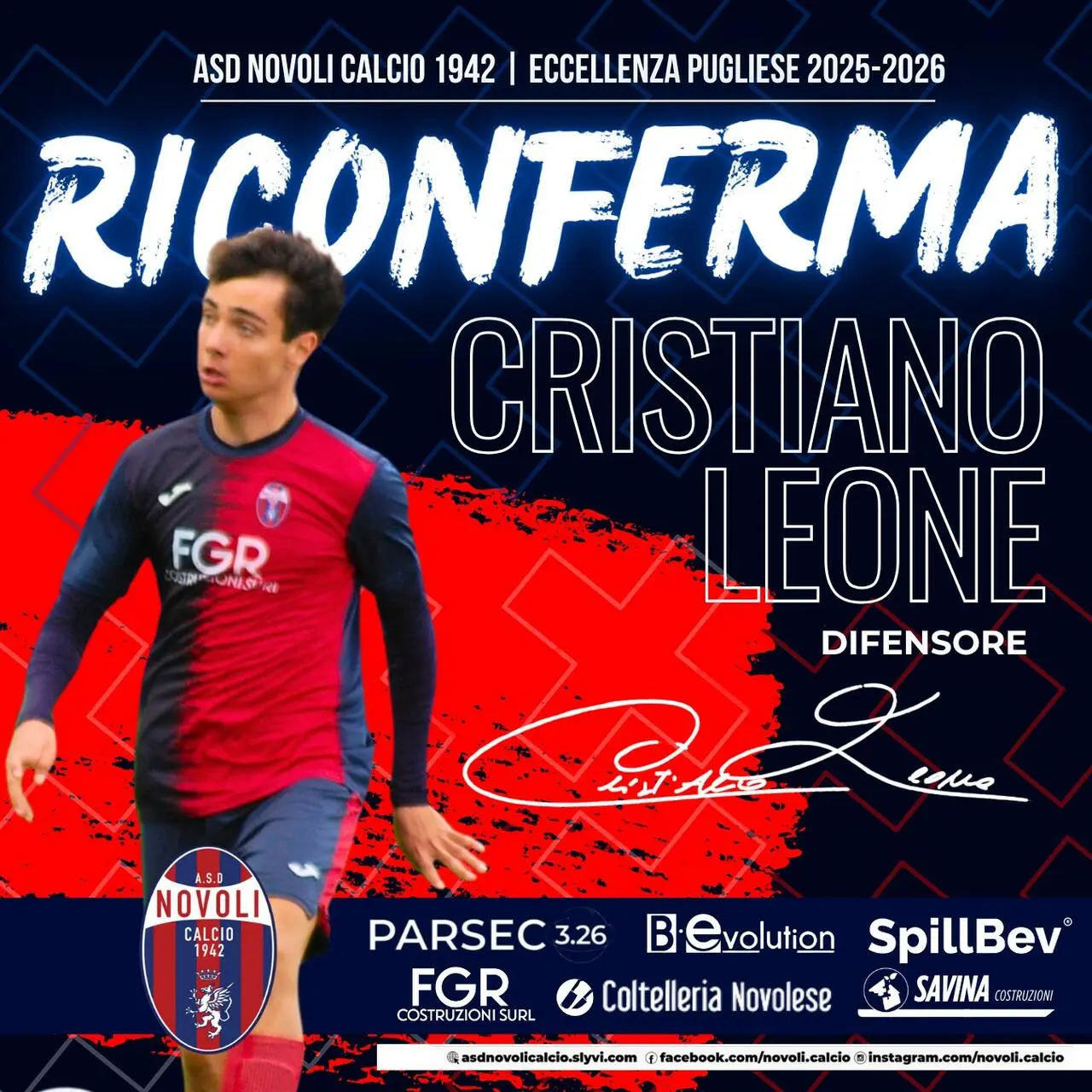 Ancora tempo di riconferme per la rosa del Novoli Calcio che affronterà il campionato di Eccellenza Pugliese. A quelle dei giorni scorsi, infatti, si aggiunge anche il rinnovo di 𝑪𝒓𝒊𝒔𝒕𝒊𝒂𝒏𝒐 𝑳𝒆𝒐𝒏𝒆, difensore di fascia giunto la scorsa stagione a gennaio e che si è saputo ritagliare importanti spazi di minutaggio, ottenendo la fiducia di mister Claudio Luperto. Un'altra giovane pedina, quindi, su cui puntare nella costruzione di una rosa che, a giorni, prevedrà l'arrivo di nuovi volti su cui l'Area Tecnica e i direttori Capone e Russo lavorano alacremente.