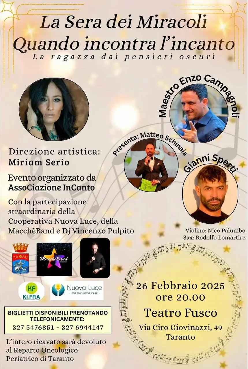 Il prossimo 26 febbraio, dalle ore 20:00, infatti, il Teatro "Fusco" di Taranto ospiterà "La Sera dei Miracoli Quando incontra l'incanto - La ragazza dai pensieri oscuri", evento organizzato dall'AssoCiazione InCanto del noto soprano Miriam Serio con il patrocinio del Comune di Taranto.