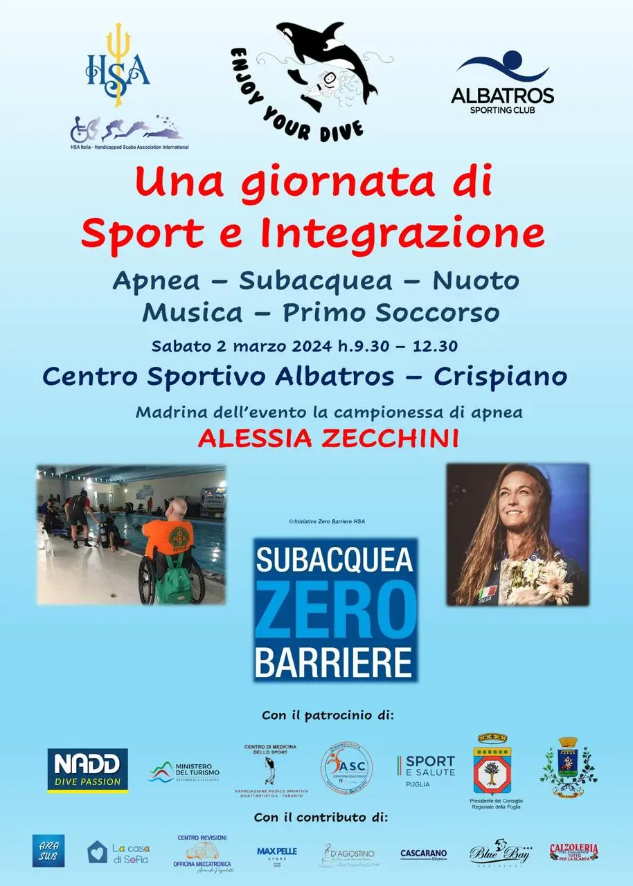 Guest star della decima edizione degli eventi HSA Zero Barriere nel territorio tarantino, nonché madrina dell’evento, Alessia Zecchini, campionessa mondiale di apnea. Presenta l'evento Matteo Schinaia.