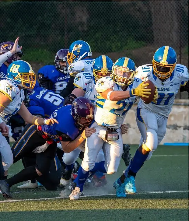 Le Vespe hanno disputato una gara difensiva di altissimo livello, mettendo costantemente in difficoltà l’attacco dei Falcons Caserta. Pressione continua, chiusura degli spazi e placcaggi puntuali hanno spezzato il ritmo offensivo avversario, costringendolo a forzare più volte le giocate.