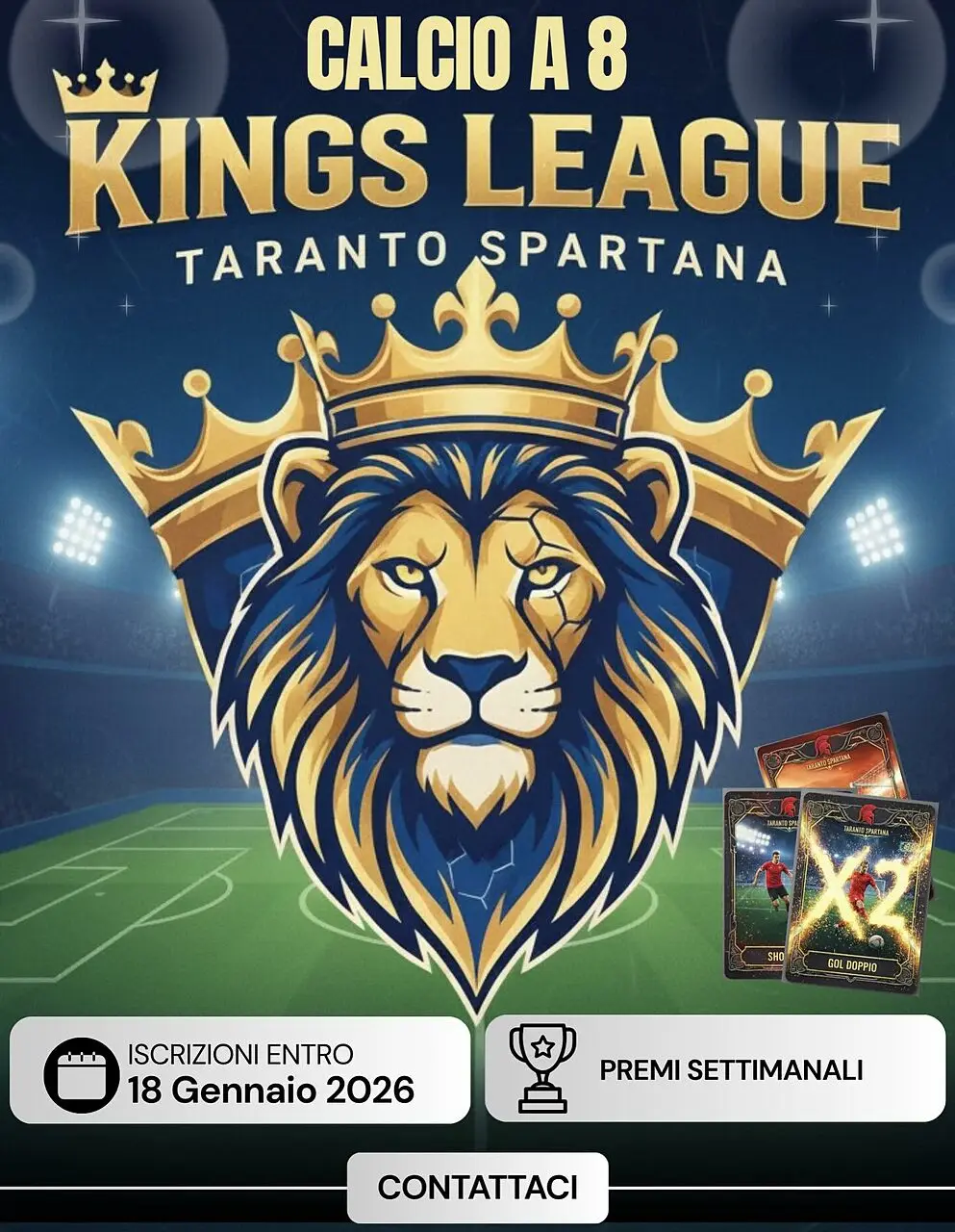 Tra i tanti grandi tornei, organizzati con passione e dedizione dall’ASD Taranto Spartana Emanuele Ciaccia e Danilo Bruno non potevano non mettersi al lavoro per avviare la Kings League Taranto Spartana di calcio a 8. Le iscrizioni sono già aperte e si protrarranno fino al 18 gennaio del 2026. Previsti premi settimanali. Per maggiori info contattare Emanuele al 366 179 2038 o Danilo al 348 720 7533.