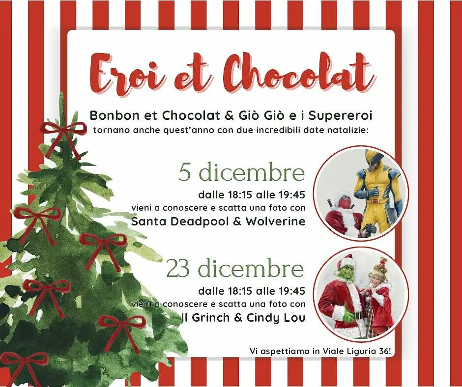 Si entra sempre più nel vivo delle festività natalizie e come ormai consuetudine da Bonbon et Chocolat non possono mancare i personaggi di Giò Giò e i Supereroi. Si parte il 5 dicembre dalle 18:15 alle 19:45 con Santa Deadpool e Wolverine che faranno divertire i passanti dando loro la possibilità di scattare tante foto. Non mancate, vi aspettiamo in Viale Liguria 36.