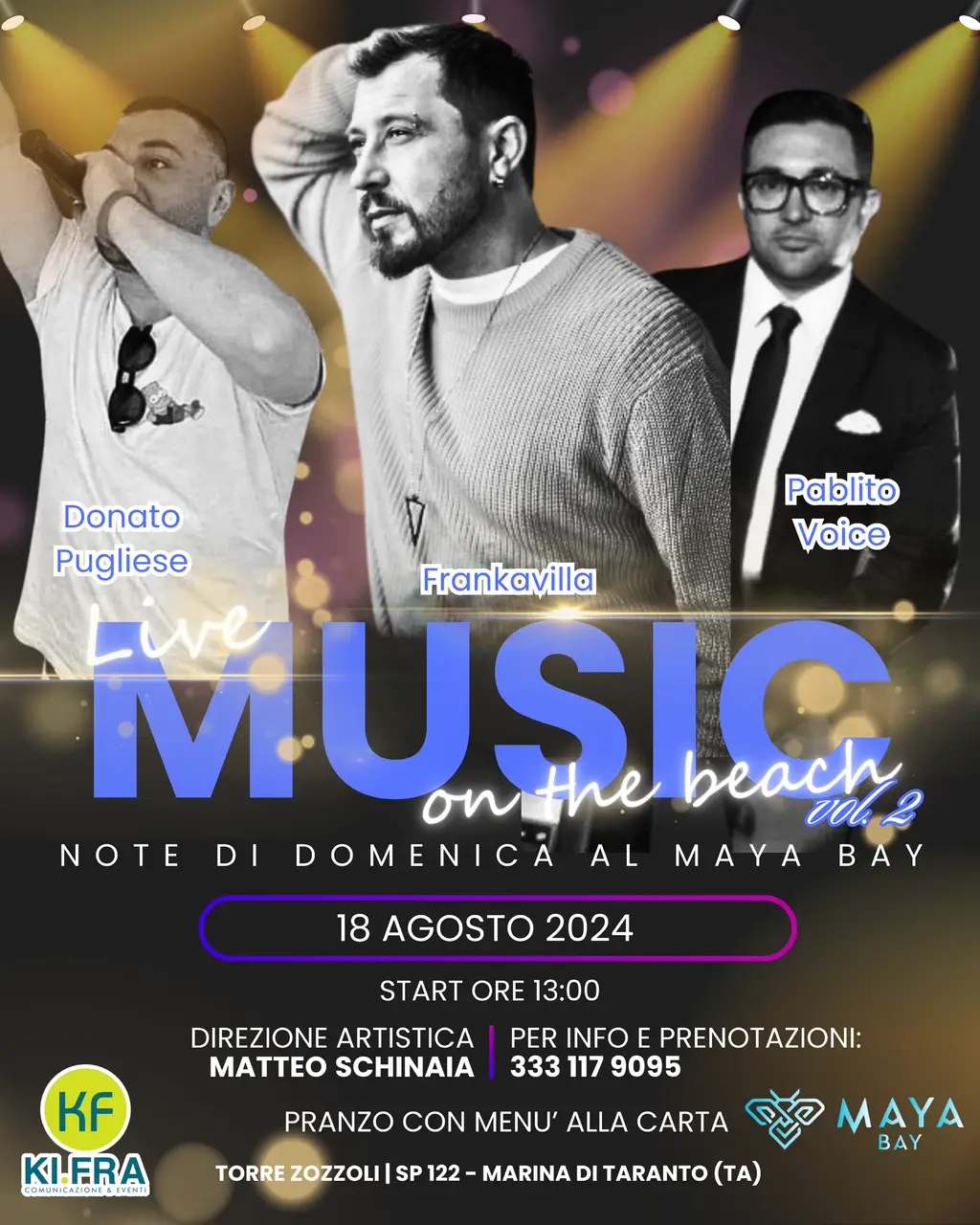"Live music on the beach vol. 2" è stata una specifica richiesta del titolare del Maya Bay, Ciro Caserta: "Abbiamo raccolto feedback estremamente positivi dopo il pranzo di Ferragosto e tante richieste di ripetere l'evento con questi bravissimi artisti. Ho contattatato il direttore artistico Matteo Schinaia e siamo riusciti a farli tornare da noi. Vi aspettiamo numerosi".