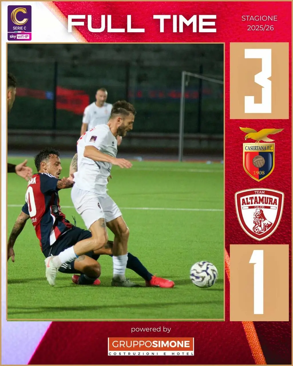 CASERTANA: De Lucia, Kontek, Llano, Proia, Kallon (59′ Galletta), Leone (72′ Di Tommaso), Pezzella, Bentivegna (86′ Bacchetti), Rocchi, Vano, Liotti (87′ Falasca). All. Coppitelli