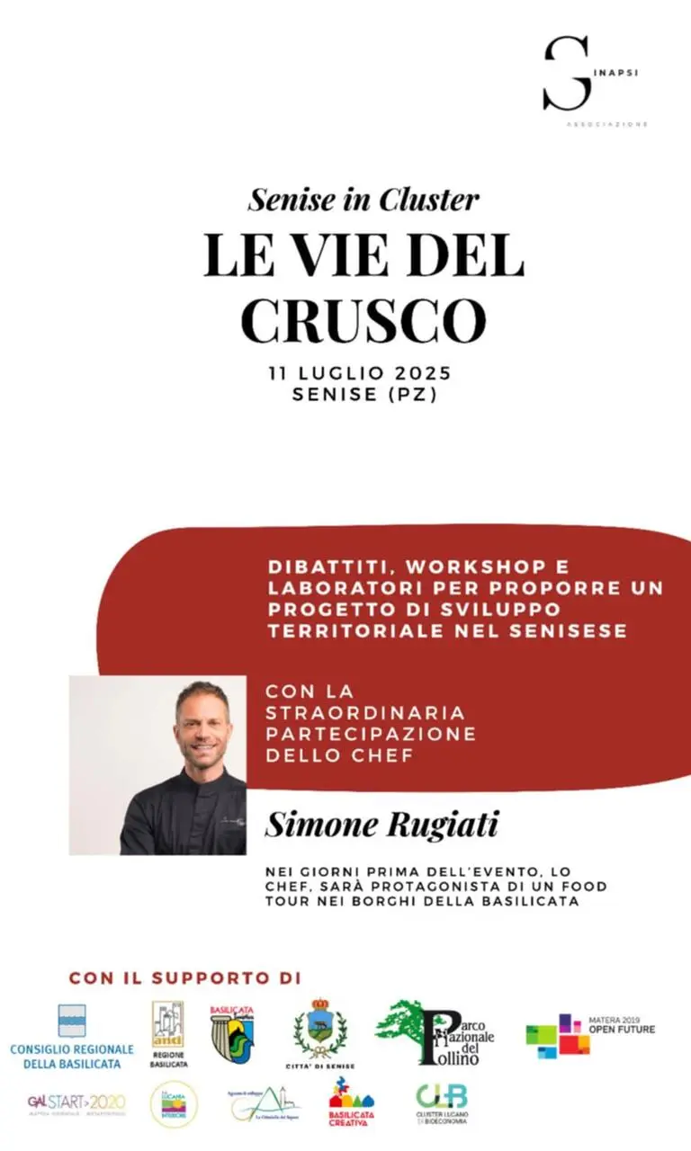 Il prossimo 9 luglio, il Comune di Pisticci ospiterà la prima tappa ufficiale del tour “Senise in Cluster – Le Vie del Crusco”, un progetto promosso dall’Associazione Sinapsi nell’ambito del programma “Le Vie del Crusco”, volto a valorizzare le eccellenze culturali, paesaggistiche e gastronomiche del territorio lucano.