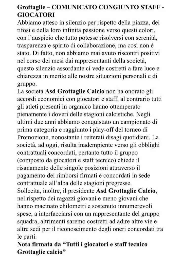 Calcio Taranto FOTONOTIZIA Grottaglie, staff e calciatori: 'La società non ha onorato gli accordi economici' 24.10.2024 12:20 0 Twitter Facebook Whatsapp Telegram Email Il comunicato dello staff e dei calciatori del Grottaglie: Commenti ASD Sparta Taranto & Ippolito Sallustio, Pavone: 'Con lo Studio De Pace Time Out mi aspetto un match combattuto' Gioiella Prisma Taranto vs Grottazzolina: una Sfida Cruciale per i rossoblù Ultime News 0 Massafra, il tecnico Marasciulo: 'Taranto squadra ancora in allestimento. Per la mia compagine una gara storica' 0 Apulia Trani (U17), capitan Isabel Losito: 'La fascia al braccio? Voglio sempre essere pronta per sostenere le mie compagne' 0 VIDEO Sassuolo-Genoa 1-2. La sintesi di SKY