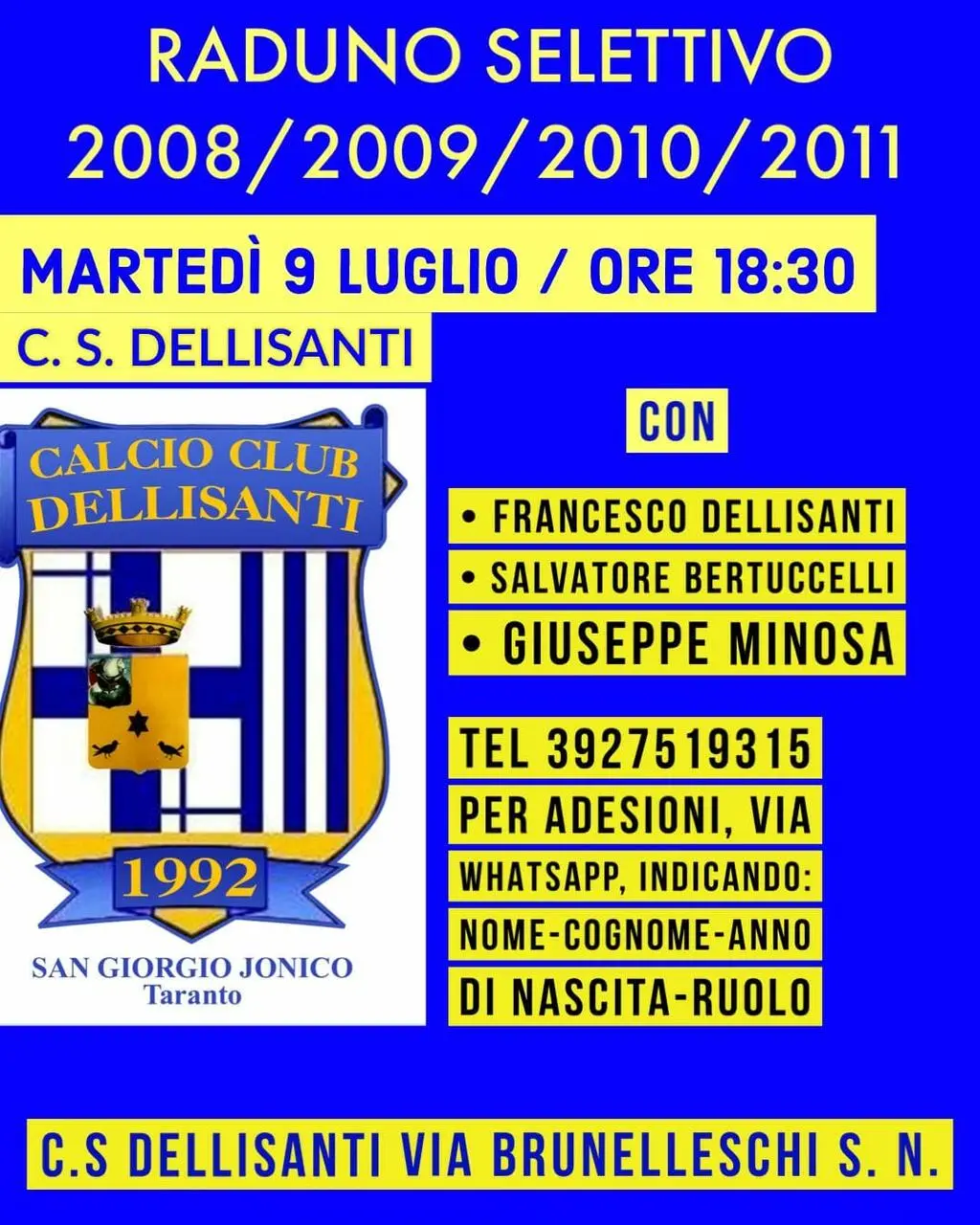 In casa Calcio Club Dellisanti si torna a lavorare sui campi con il primo raduno selettivo per ragazzi nati nel 2008, 2009, 2010 e 2011 che si terrà martedì 9 luglio presso il Centro Sportivo Dellisanti di San Giorgio sotto l'attenta supervisione dei tecnici Franco Dellisanti, Salvatore Bertuccelli e Giuseppe Minosa. Per info e adesioni chiamare il numero 3927519315.