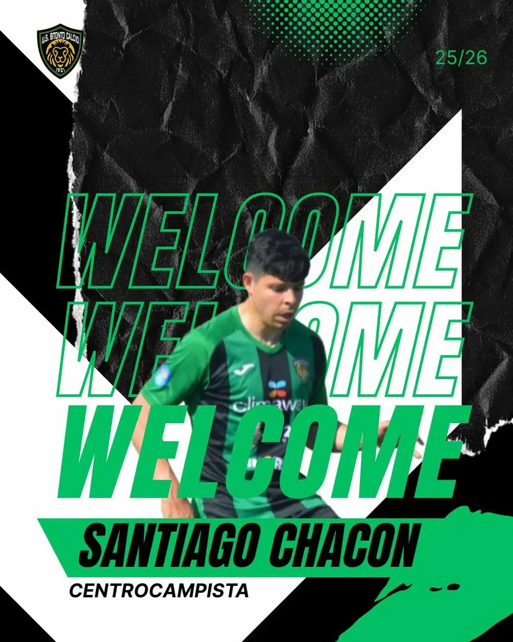 Arriva ufficialmente in neroverde l'esperto trequartista argentino Santiago Chacon classe 1992 ex Fbc Gravina. Per lui è un ritorno a Bitonto avendo già indossato questa maglia in passato. Un acquisto che permette di innalzare maggiormente il tasso di esperienza e qualità dell'organico. Il giocatore sarà già a disposizione di mister Zinfollino già nella trasferta di domani ad Ugento.