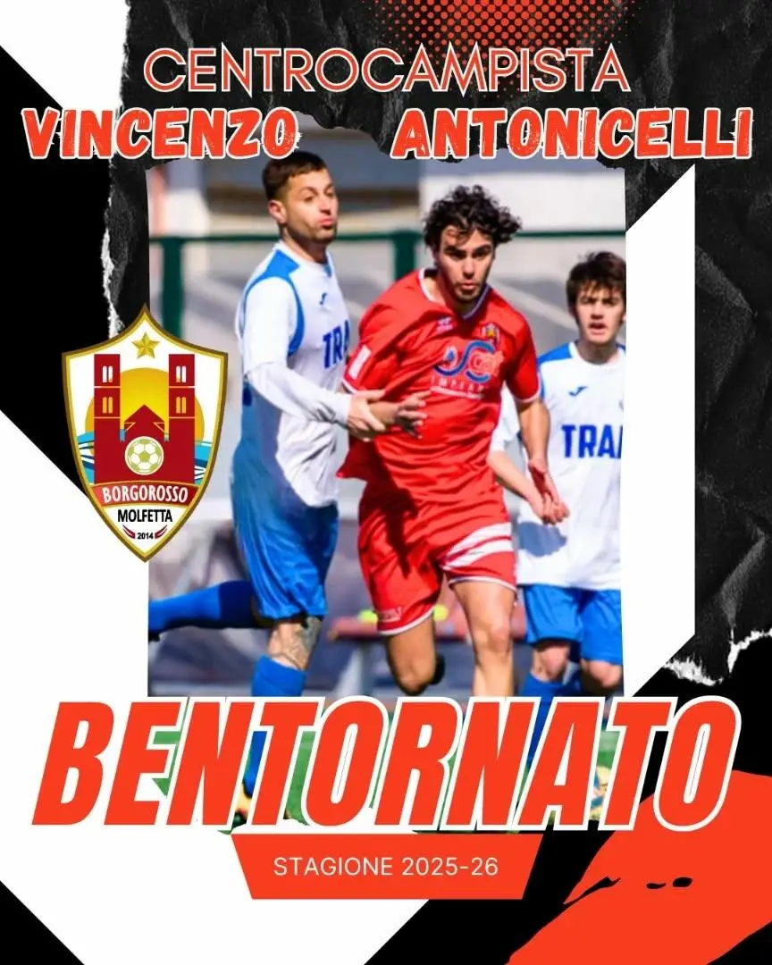 Il Borgorosso Molfetta è lieto di annunciare il ritorno in biancorosso del centrocampista 𝗩𝗶𝗻𝗰𝗲𝗻𝘇𝗼 𝗔𝗻𝘁𝗼𝗻𝗶𝗰𝗲𝗹𝗹𝗶, classe 2000. Per lui si tratta di un gradito ritorno: il centrocampista ha già indossato la maglia del Borgorosso nel biennio 2021-2023 in Eccellenza Pugliese, totalizzando 28 presenze nel massimo campionato regionale e dimostrando grande affidabilità e spirito di sacrificio in mezzo al campo.