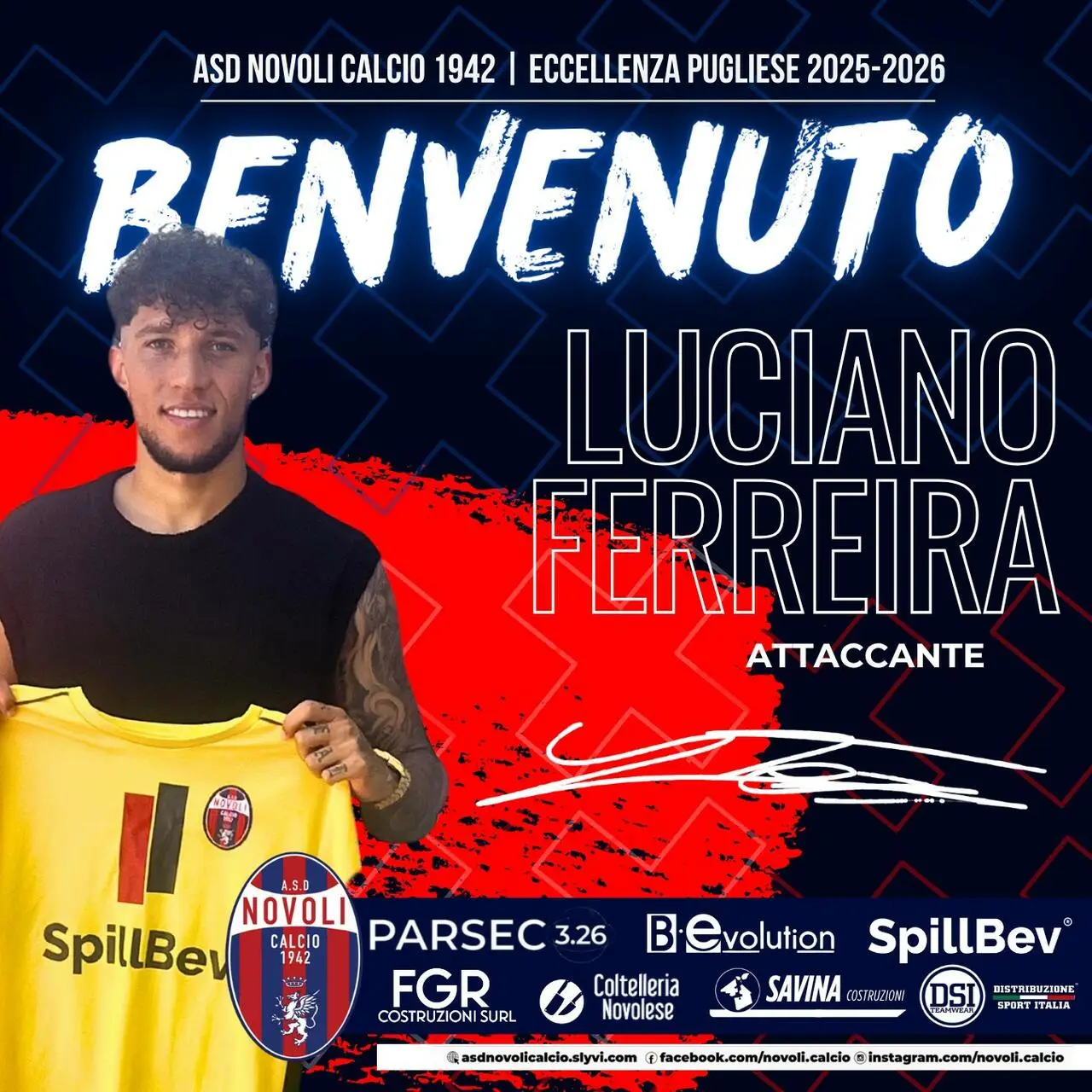 Nuovo volto per l'attacco, settimo colpo del calciomercato estivo del Novoli Calcio, velocità, abilità e senso del gol per la rosa di mister Luperto che sarà impegnata nel torneo di Eccellenza Pugliese 2025/2026. 𝑳𝒖𝒄𝒊𝒂𝒏𝒐 "𝑳𝒖𝒄𝒉𝒐" 𝑭𝒆𝒓𝒓𝒆𝒊𝒓𝒂, italo-uruguaiano classe 2000, sarà un volto nuovo anche per il "Girone Unico", dopo essersi distinto nei Dilettanti della Basilicata con le maglie di Città di Matera (Promozione) e Montescaglioso (Eccellenza), con più di 20 goal all'attivo. Prima di approdare in Italia, esperienze spagnole con le casacche dell'Atletico Astorga e Cd La Granja e nella formazione under 19 del Weston. Gli addetti ai lavori parlano di potenza fisica e intensità agonistica, per un calciatore che nelle recenti esperienze italiane ha impressionato anche per le sue giocate imprevedibili e per il fiuto della porta.