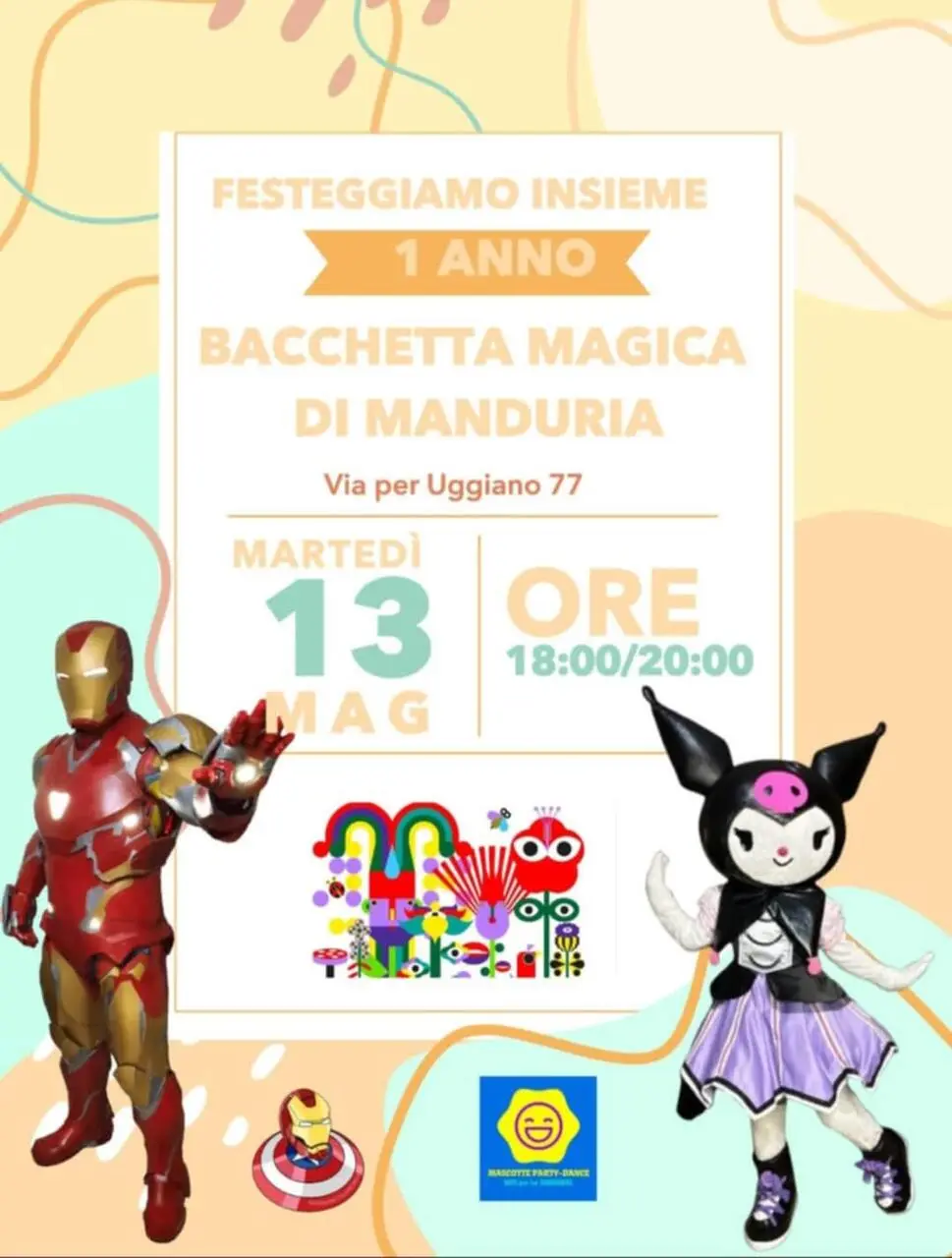 Martedì 13 maggio a Manduria imperdibile appuntamento con l'Associazione Giò Giò e i Supereroi. Di fatto in occasione dei festeggiamenti (dalle 18:00 alle 20:00) per il primo anno di attività della sala “La Bacchetta Magica” sarà presente Iron Man che come sempre intratterrà al meglio i presenti scattando tante foto e regalando sorrisi a grandi e piccini. Vi aspettiamo numerosi!