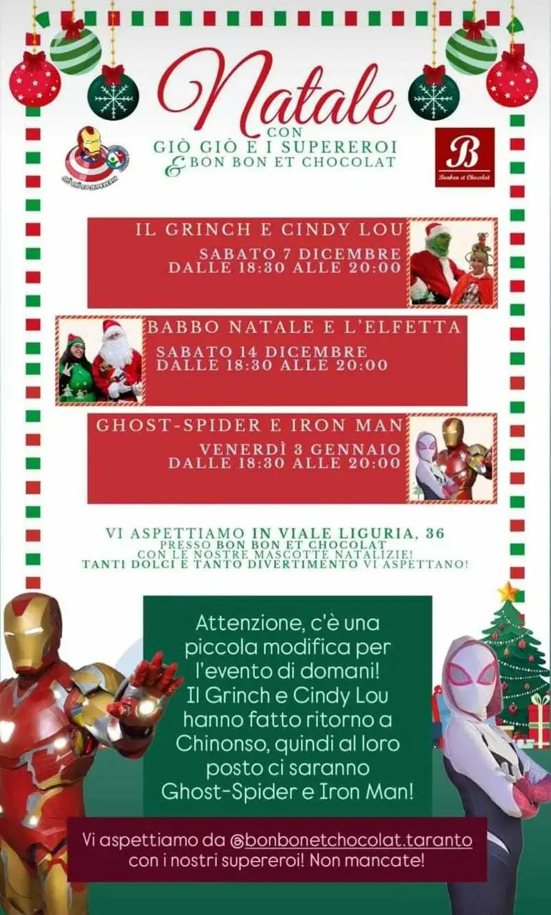 Il periodo natalizio con l’Associazione Giò Giò e i Supereroi continua con un altro straordinario evento presso Bon Bon Et Chocolat (Via Liguria 36). Il 3 gennaio dalle 18:30 alle 20:00 Ghost Spider e Iron Man animeranno il vostro passeggio a suon di foto. Vi aspettiamo!