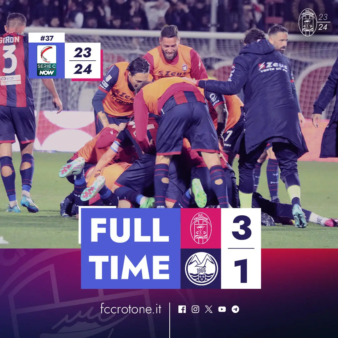 CROTONE: D’Alterio; Leo (33’st Rispoli), Gigliotti, Loiacono; Tribuzzi, D’Errico (20’st Felippe), Vinicius, D’Ursi (20’st Kostadinov), Giron; Tumminello (33’st D’Angelo), Gomez (41’st Comi). A disp. : Dini, Martino, Bove, Papini, Crialese, Cantisani. All. Zauli