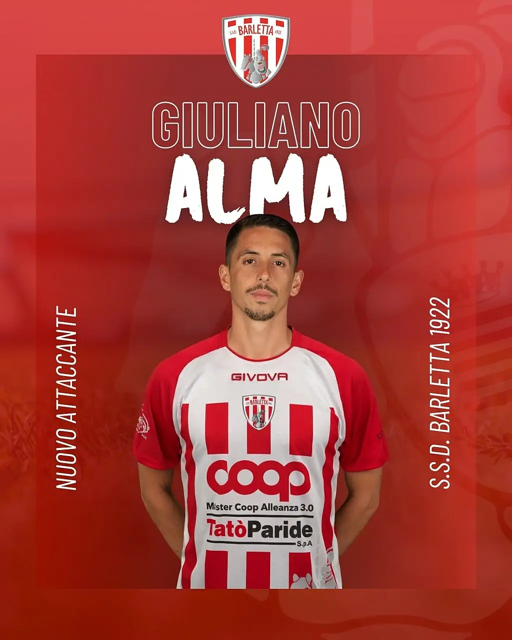 La S.S.D. Barletta 1922 comunica di aver acquisito le prestazioni sportive del calciatore Giuliano Vincenzo Alma, attaccante esterno classe 1993, proveniente dal Siracusa Calcio.