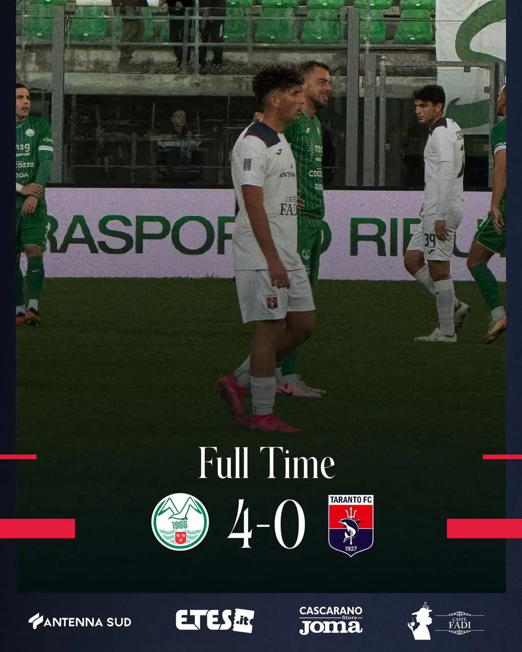 TARANTO (3-4-1-2): 1 Del Favero; 6 Shiba (45' 5 Marong), 4 De Santis, 14 Verde; 72 Mastromonaco, 8 Fiorani (63' 18 Schirru), 39 Iervolino (82' 17 Sacco), 24 Speranza; 20 Guarracino; 99 Battimelli, 11 Zigoni. A disposizione: 94 Meli, 27 Garau, 33 Vaughn, 34 Locanto, 77 Zerbo, 80 Fiorentino. Allenatore: Cazzarò