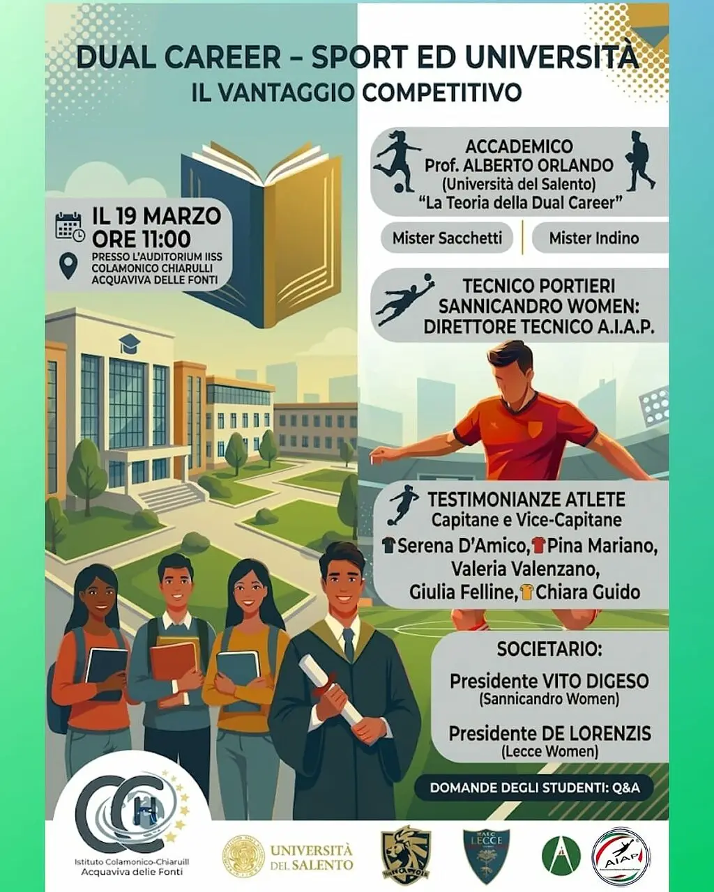 L’iniziativa affronterà una delle sfide più attuali e significative per i giovani atleti: quella di riuscire a conciliare in maniera efficace la carriera sportiva agonistica con il percorso di studi universitario. Un tema centrale, dunque, che sarà sviluppato attraverso il confronto diretto con le protagoniste del calcio d’eccellenza dell’ASD Sannicandro Women e del Lecce Women, chiamate a raccontare esperienze, sacrifici, ambizioni e prospettive legate al binomio tra sport, studio e crescita personale.