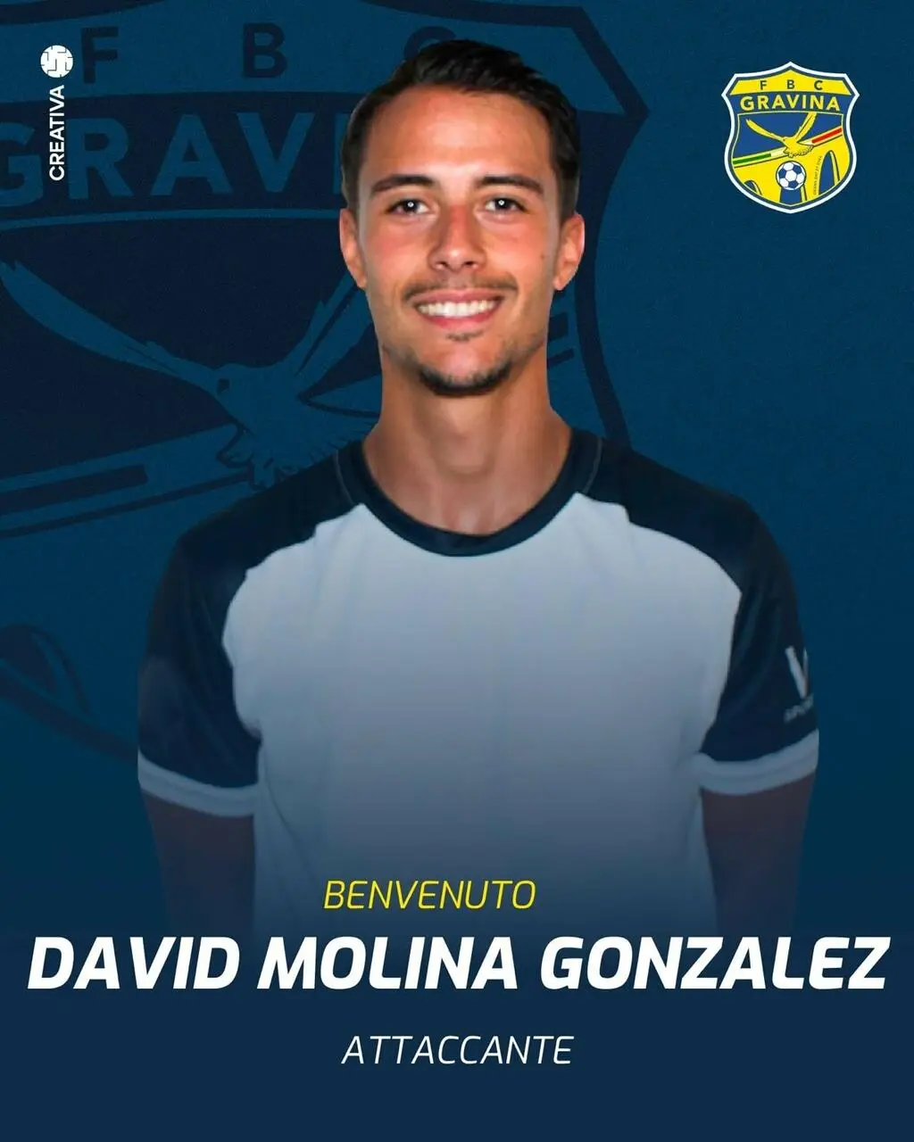 La FBC Gravina comunica di aver acquisito le prestazioni sportive del calciatore José David Molina Gonzalez. Nato a Leganes (Spagna) nel 1998, Molina è un attaccante rapido e dinamico, capace di agire su tutto il fronte offensivo. Dotato di ottime qualità tecniche, Molina è arrivato in Italia nella passato stagione, militando nel Galatina, club di Eccellenza pugliese, con il quale ha realizzato 20 reti, vincendo il titolo di capocannoniere.