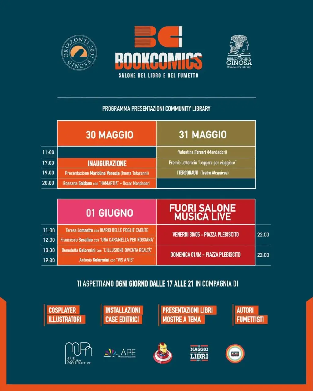 Un altro grande evento per l’Associazione Giò Giò e i Supereroi che nei giorni 30 e 31 maggio e 1 giugno dalle 17 alle 21 (domenica 1 giugno anche dalle 11:30 alle 13) saranno al Book Comics – Salone del Libro e del Fumetto che si terrà presso la Community Library in Corso Vittorio Emanuele II, 95 a Ginosa. Nel corso dell’evento i visitatori potranno ammirare il gigantesco Hulk che sarà in esposizione oltre che, ogni giorno, avere la possibilità di scattare foto con un supereroe differente.