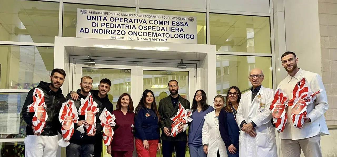 Ieri sera, dopo l’allenamento, capitan Di Cesare, insieme con Francesco Vicari, Peppe Sibilli, Raffaele Pucino e Marco Nasti hanno fatto visita ai piccoli pazienti del reparto di Oncoematologia Pediatrica del Policlinico di Bari, guidato dal prof. Santoro. È stata l’occasione per salutarli, chiacchierare con le famiglie e il personale medico che ogni giorno li assiste, giocare con i piccoli pazienti in ludoteca e regalare un po’ di dolcezza con le uova di Pasqua biancorosse, donate dal nostro Official Partner Dulciar.