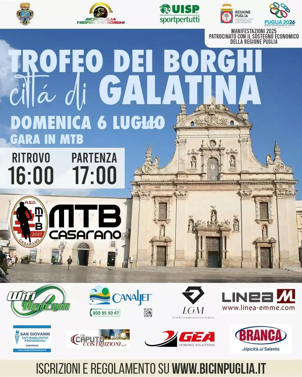 Domenica 6 luglio 2025 andrà in scena la prima tappa del “Trofeo dei Borghi – Città di Galatina”, evento inaugurale del circuito estivo di Bicinpuglia 2025, organizzato dall' MTB Casarano.